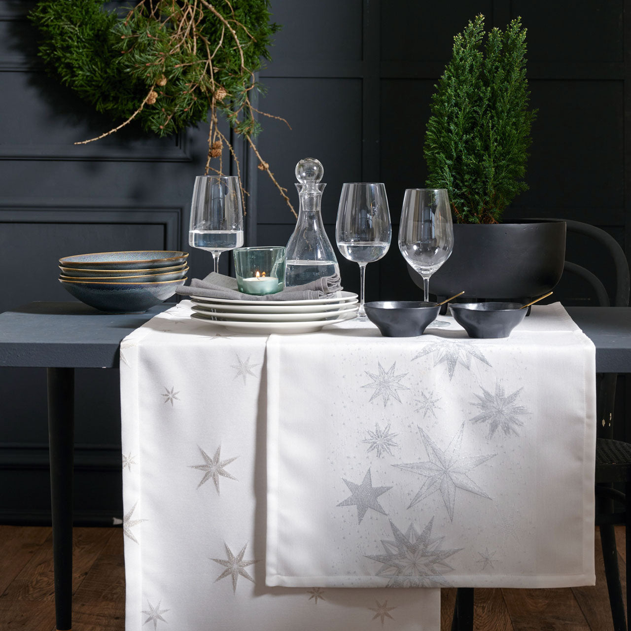 Weihnachts-Klassiker für stimmungsvolles Wohnen von Apelt. Kunstvoll in Jacquardtechnik gewebtes Sternenmotiv als all-over gestaltet und veredelt mit glänzenden Lurexfäden. Viele verschiedene Größen und Farbstellungen, erstklassige Verarbeitung als eleganter Läufer mit aufwändig genähter Briefecke, als Tischdecke, als Tischband mit Spitze. Die Kissenhülle hat einen praktischen Reißverschluss. Das pflegeleichte, hochwertige Material besteht aus 65% Polyester, 30% Viskose und 5% Polyacryl. Waschbar mit 30°C im Schonwaschgang, Kissen vorher auf links wenden, feucht aufhängen, auf 2 Punkt bügeln - ohne Dampf. Schadstoffgeprüft nach Ökotex-Standard 1oo und made in Germany.