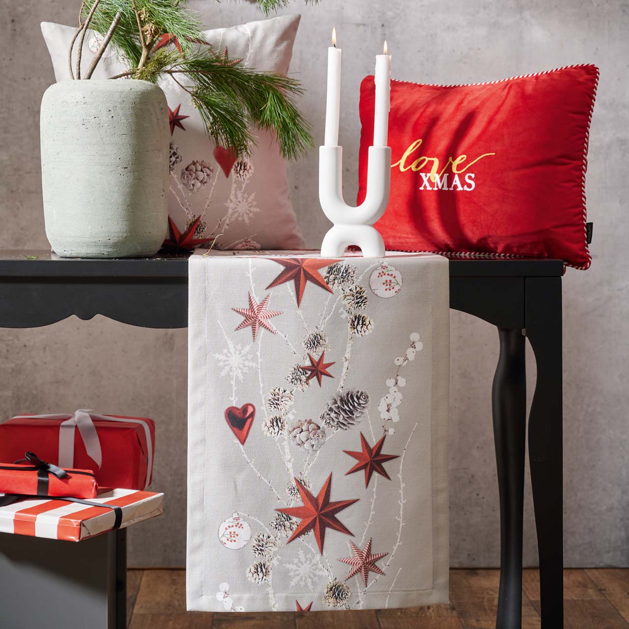 Trendiges Winter-Motiv aus dem Hause Apelt. Moderne Winterzweige mit allerlei Weihnachtsschmuck für die jahreszeitliche Weihnachtsdeko, in drei schönen Farbstellungen, als Läufer mit Briefecke konfektioniert. Die Kissenhülle hat einen praktischen Reißverschluß. Der hochwertig designte Digitaldruck ist auf 100% Baumwolle produziert. Waschbar mit 30°C im Schonwaschgang, Kissen vorher auf links wenden, feucht aufhängen, auf 2 Punkt bügeln. Schadstoffgeprüft nach OEKO?TEX® STANDARD 100 (16.0.97246) und made in Europe.