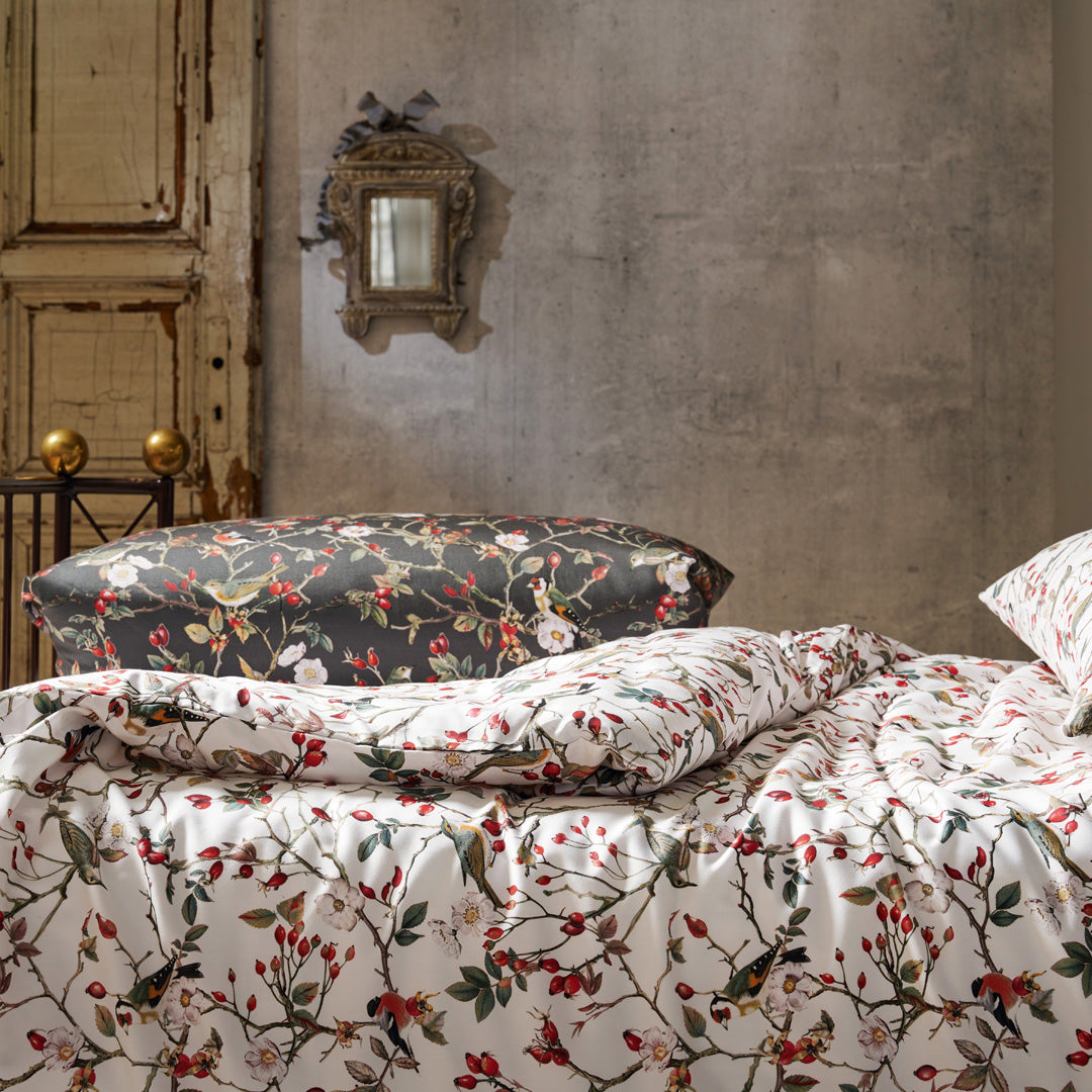 Ad(k>Unsere Bettwäsche FREYA steht für extravagante DesignBettwäsche im trendy Herbstzeit-Stil. Liebevoll gemalte Singvögel auf romantischen Hagebutten-Zweigen sind ein modisches Statement im Schlafbereich. Das Bettwäsche-Set bestehend aus Kissen + Deckbezug sind aus 100% Premium-Baumwoll-Satin, mercerisierte Baumwolle, atmungsaktive Naturfaser und haben einen weichen, seidigen Griff und sind resourcenschonend hergestellt dank umweltfreundlichem farbbeständigem Digitaldruckverfahren. Unsere Bettwäsche ist Pflege-u. Bügelleicht, Trocknergeeignet und hat ein verdeckt-eingenähten Markenreißverschluss. Unsere Produkte sind Schadstoffgeprüft nach OEKO?TEX® STANDARD 100 (16.0.97246), tragen das Umwelt-Zertifikat GOTS für nachhaltig produzierte Bettwäsche und sind Made in Germany.