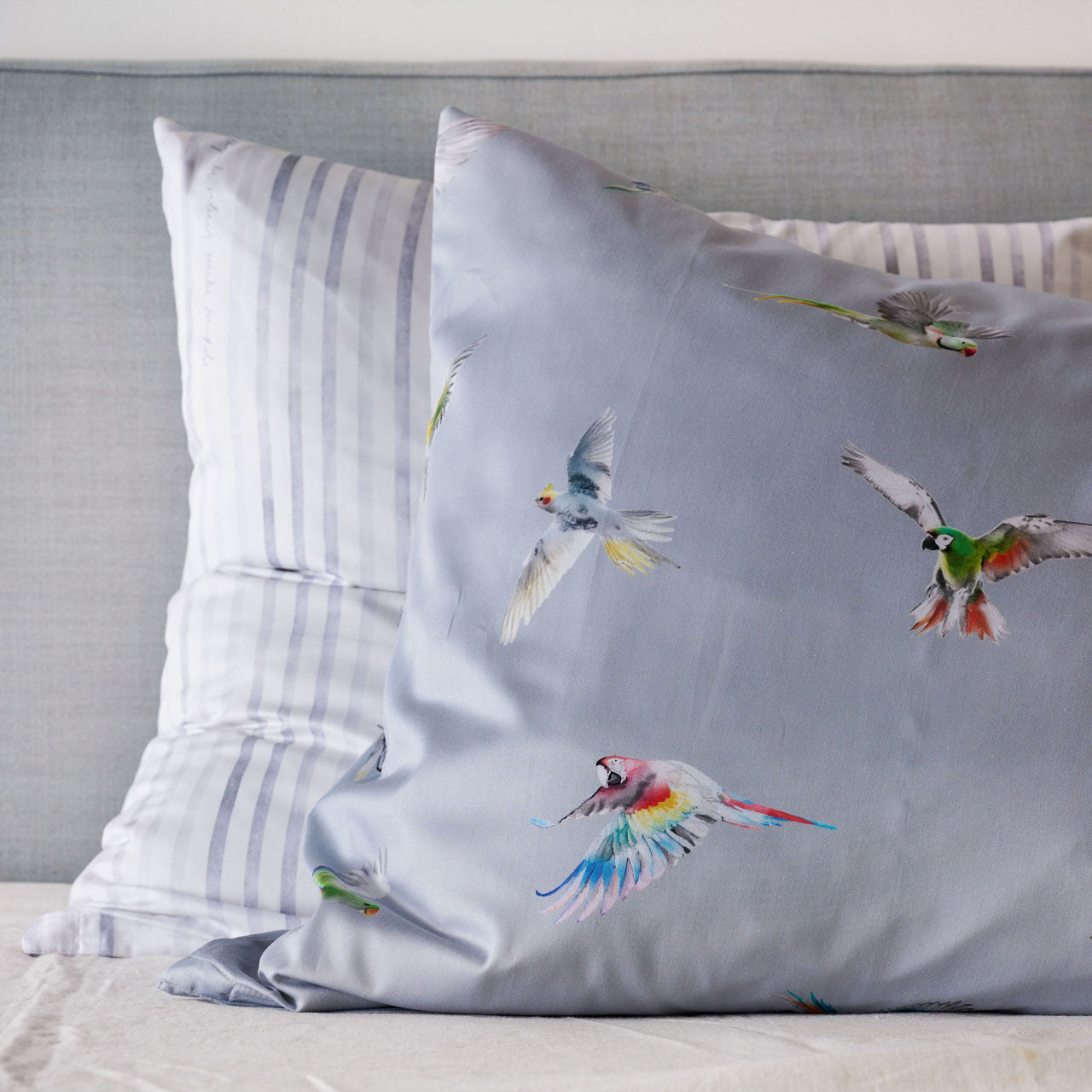 Unsere Frühjahrs/Sommer- Bettwäsche LOLA steht für exklusive Design-Bettwäsche im zeitgemäßen Stil. Exotische, zart kolorierte Papageien schweben träumerisch umher. Unsere handaquarellierten Motive sind ein elegantes Statement im Schlafbereich. Das Bettwäsche-Set bestehend aus Kissen + Deckbezug ist aus 100% Premium-Baumwoll-Satin, mercerisierte Baumwolle, atmungsaktive Naturfaser und haben einen weichen, seidigen Griff und sind resourcenschonend hergestellt dank umweltfreundlichem farbbeständigem Digitaldruckverfahren. Unsere Bettwäsche ist pflege-und bügelleicht, trocknergeeignet und hat einen verdeckt eingenähten Markenreißverschluss. Schadstoffgeprüft nach OEKO TEX® STANDARD 100 (16.0.97246), tragen das Umwelt-Zertifikat GOTS für nachhaltig produzierte Bettwäsche und sind Made in Germany.