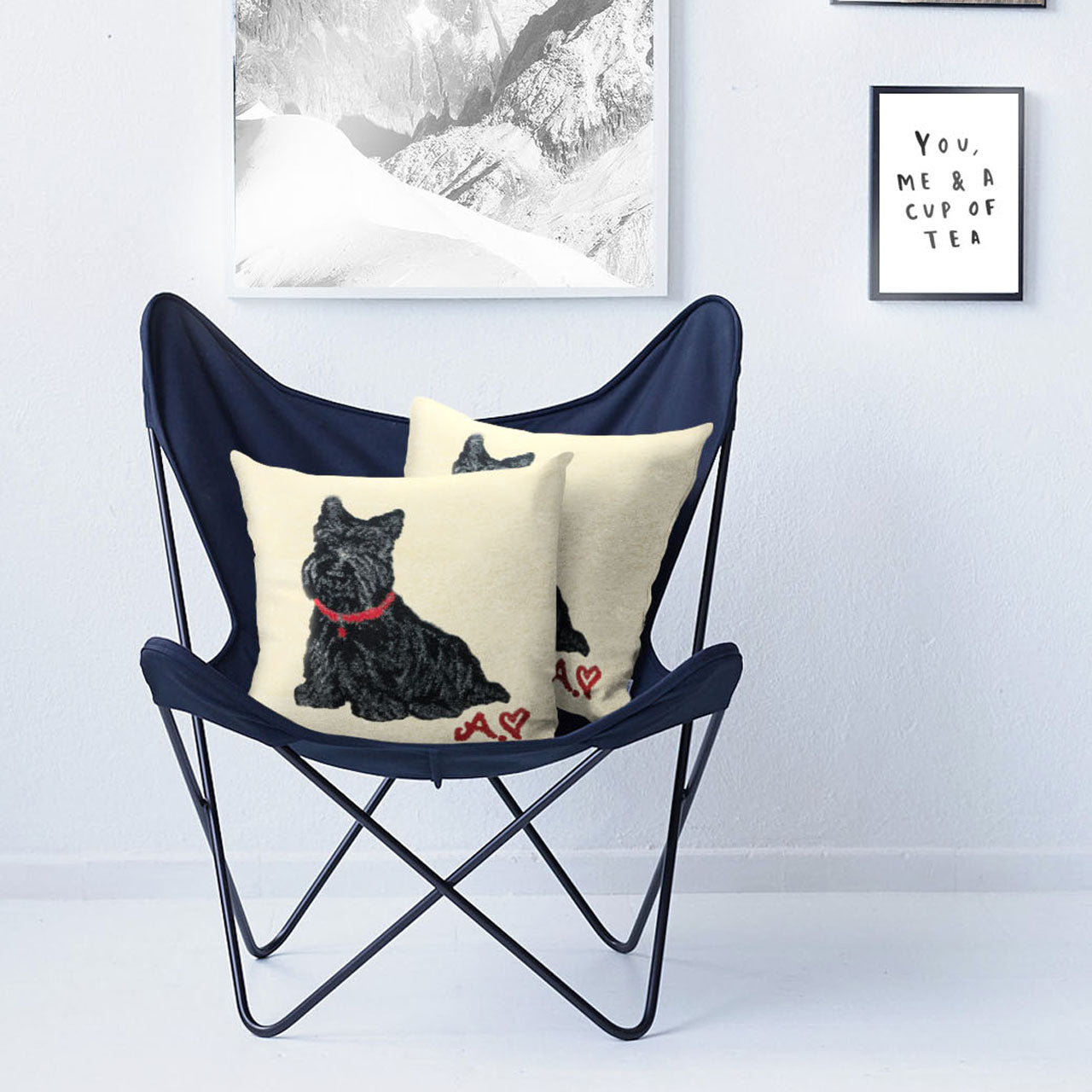 Exklusives Statementkissen aus gealkter Wolle mit eingewebtem Motiv dem Hause Apelt. Der süße Terrier bringt als Geschenk, das man sich selbst macht oder anderen lieben Menschen viel Freude ins Zuhause. Das hochwertig verarbeitete Kissen besteht aus 65% natürlicher Schurwolle und 35% Polyester, hat eine Rückseite aus weichem Samt, einen praktischen Reißverschluss. Schadstoffgeprüft nach OEKO TEX® STANDARD 100 (16.0.97246) und made in Europe.